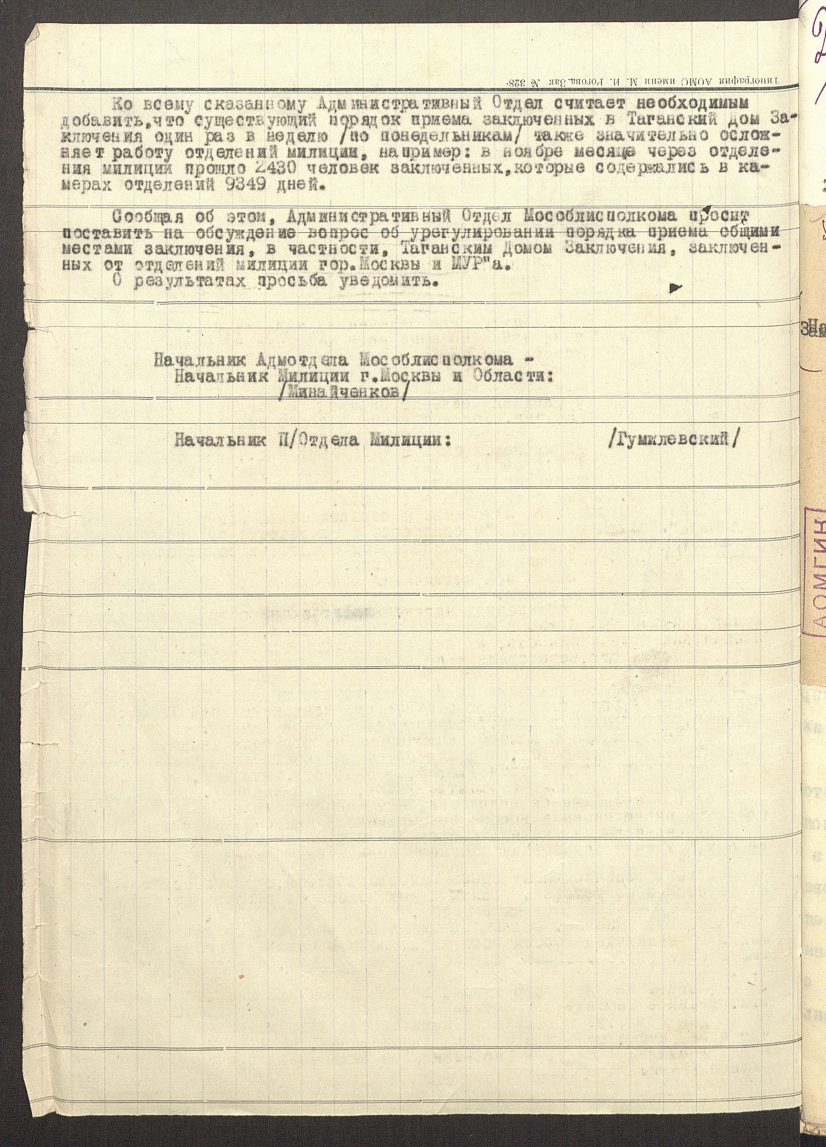 [в НКВД -- нач адмотдела моик, нач. милиции М. и обл. Минайченков, нач. п/отд. милиции Гумилевский]