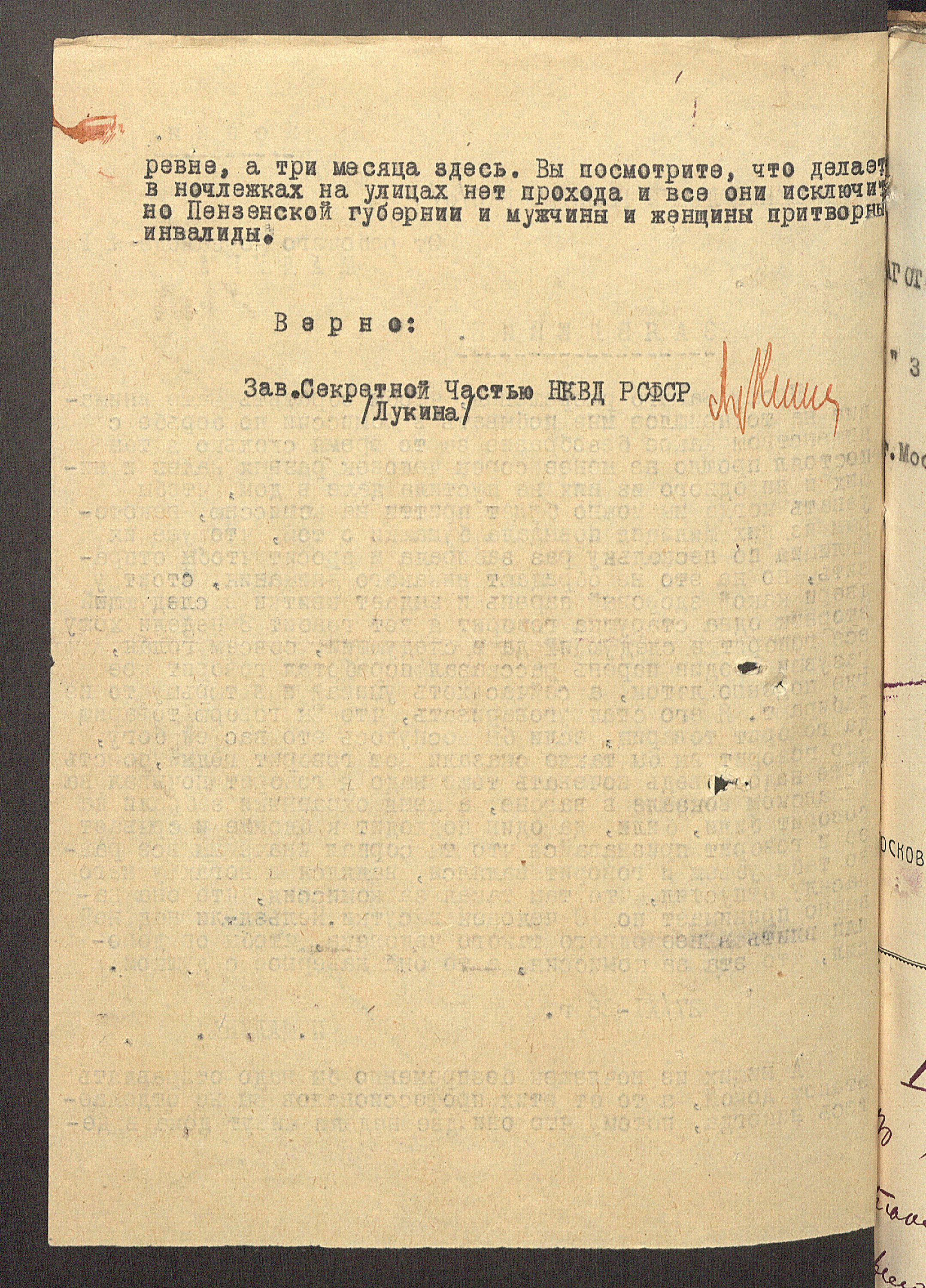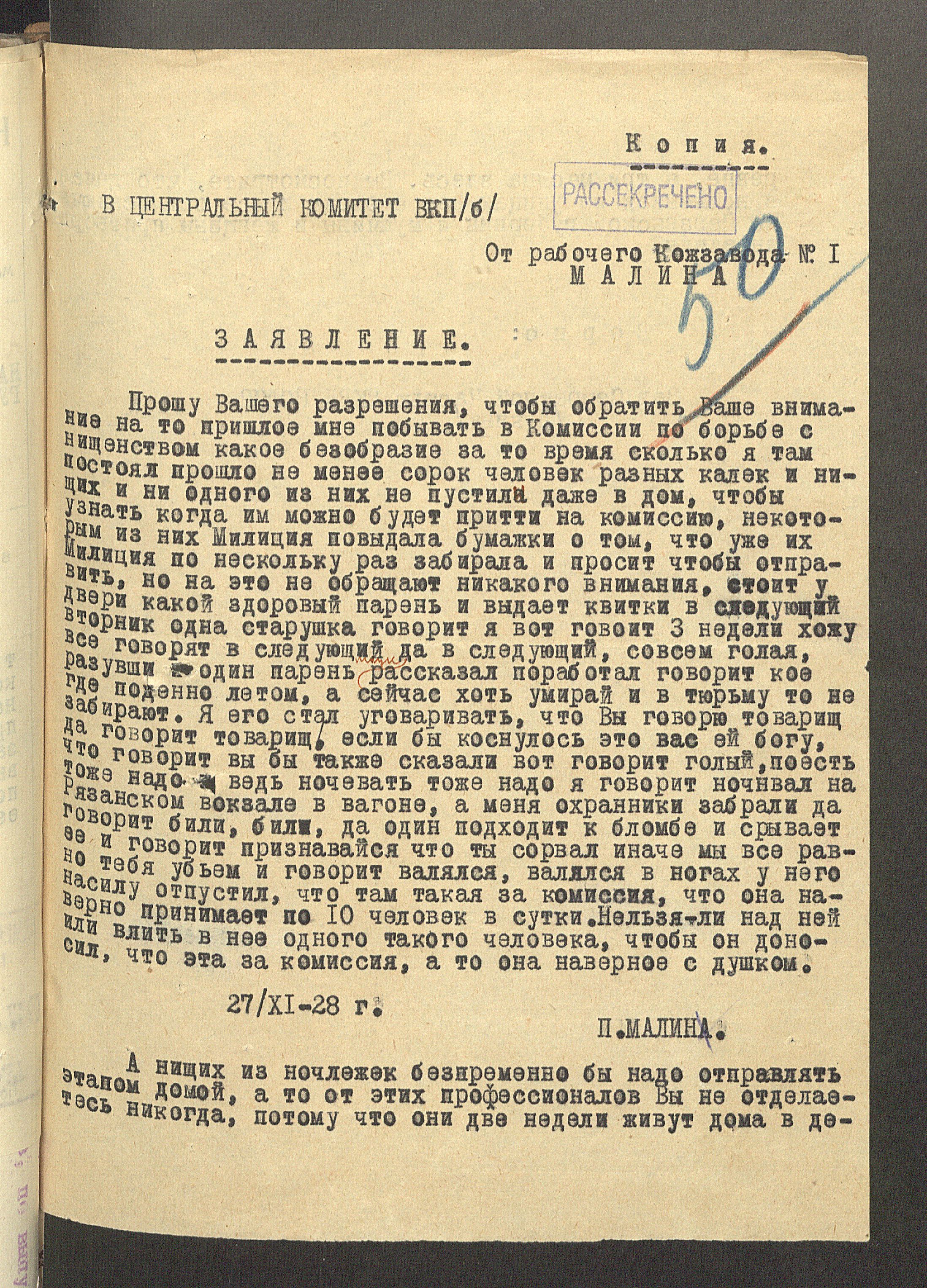 Л. 50 с об. Копия [штамп Рассекречено] [Заявление рабочего кожзавода #1 Малина П. в ЦК ВКПб по поводу работы Комиссии по борьбе с нищенством. Заверено зав. Секретной частью НКВД РСФСР Лукиным]