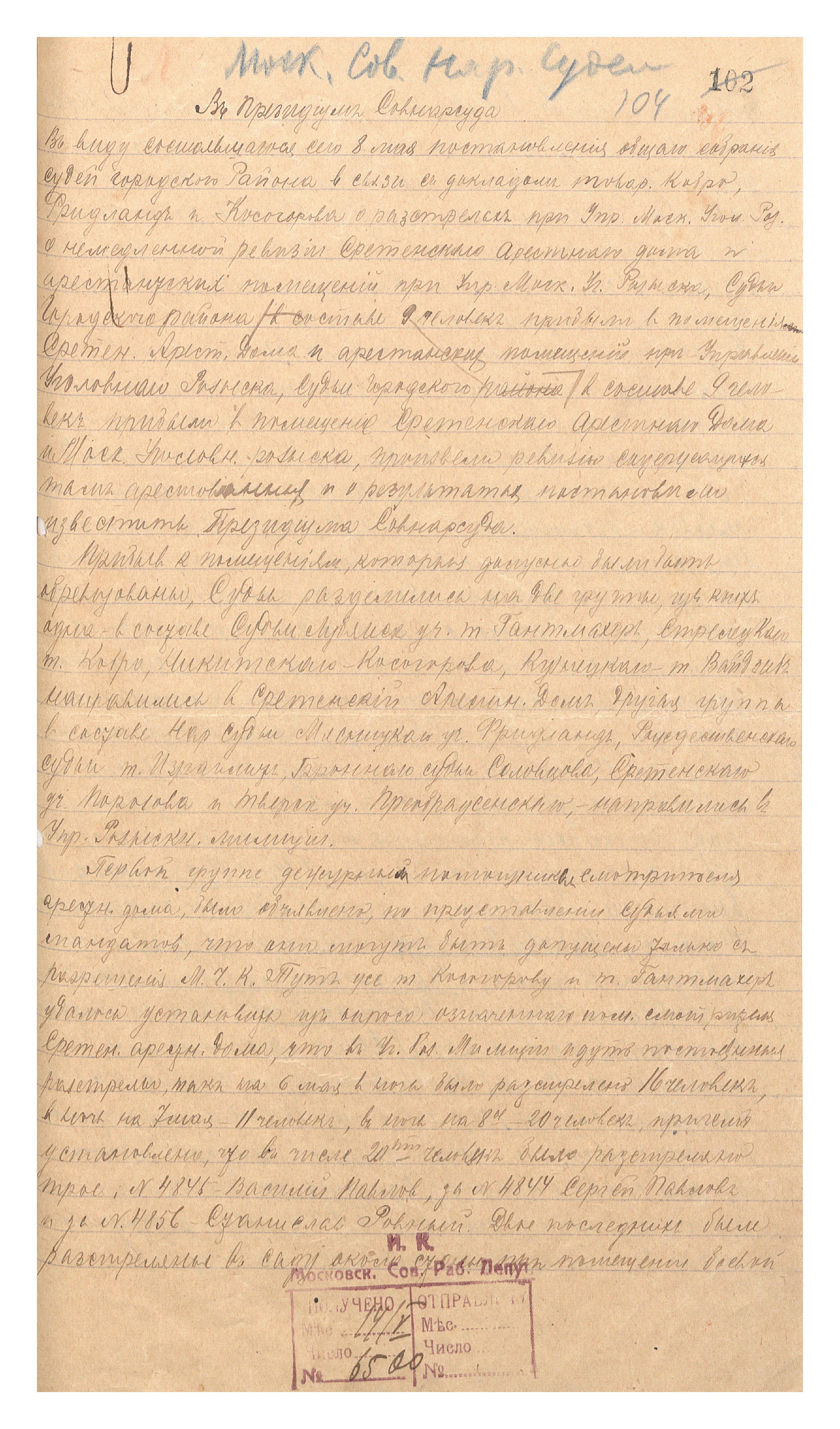 Придя к помещениям, которые должны были быть обревизованы, судьи разделились на две группы, из которых одна в составе судьи Лубянск. уч. т. Гантмахер, Стрелецкого т. Кобр, Никитского – Косогорова, Кузнецкого – т. (нрзб) направились в Сретенский арестный дом, другая группа в составе нар[одного] судьи Мясницкого уч. – Фридланда, Рождественского [участка] судьи т. Израильчука , Бронного [участка] судьи Соловцова, Сретенского уч. – т. Порогова и Тверск. уч. т. Преображенского направились в Упр[авление] Розыскн. милиции.