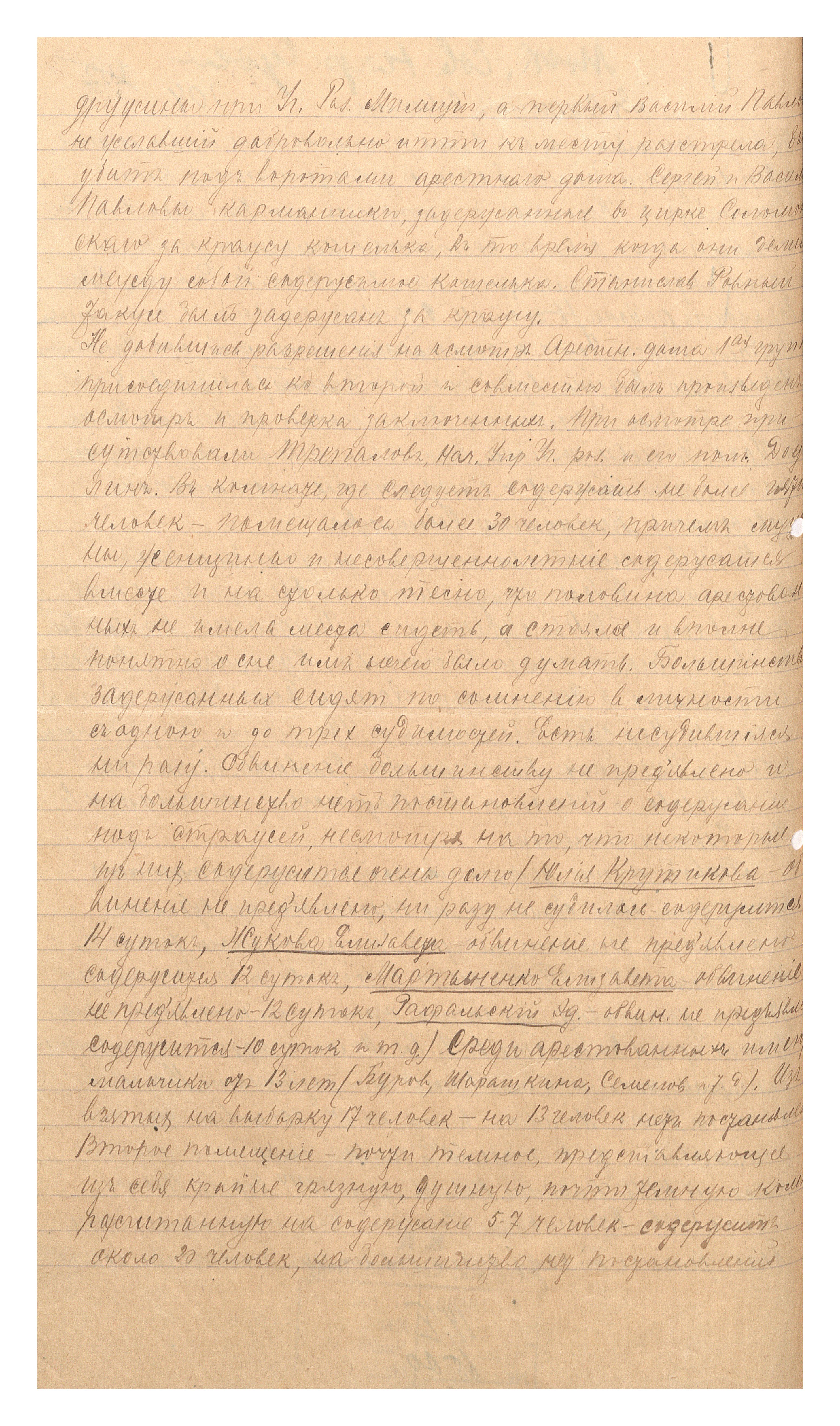 Не добившись разрешения на осмотр Арестн. дома, 1-ая группа присоединилась ко второй и совместно был произведен осмотр и проверка заключенных. При осмотре присутствовали Трепалов, нач. Упр. Уг. роз. и его помощник Додлин. В комнате, где следует содержать не более пяти человек – помещалось более 30 человек, причем мужчины, женщины и несовершеннолетние содержатся вместе и настолько тесно, что половина арестованных не имела место сидеть, а стояла и вполне понятно о сне им нечего было думать. Большинство задержанных сидят по сомнению в личности, с одною и до трех судимостей. Есть не судившиеся ни разу. Обвинения большинству не предъявлено и на большинство нет постановлений о содержании под стражей, несмотря на то, что некоторые из них содержатся очень долго (Юлия Крутикова – обвинение не предъявлено, ни разу не судилась, содержится 14 суток, Жукова Елизавета – обвинение не предъявлено, содержится 12 суток, Мартыненко Елизавета – обвинения не предъявлено – 12 суток, Рафальский Эд. – обвин. не предъявлено, содержится 10 суток и т.д.). Среди арестованных имеются мальчики от 13 лет (Буров, Шарашкин, Семенов и т.д.). Из взятых на выборку 17 человек – на 13 человек нет постановления . Второе помещение – почти темное, представляющее из себя крайне грязную, душную, почти темную комнату, рассчитанную на содержание 5– 7 человек – содержит около 20 человек, на большинство нет постановлений.