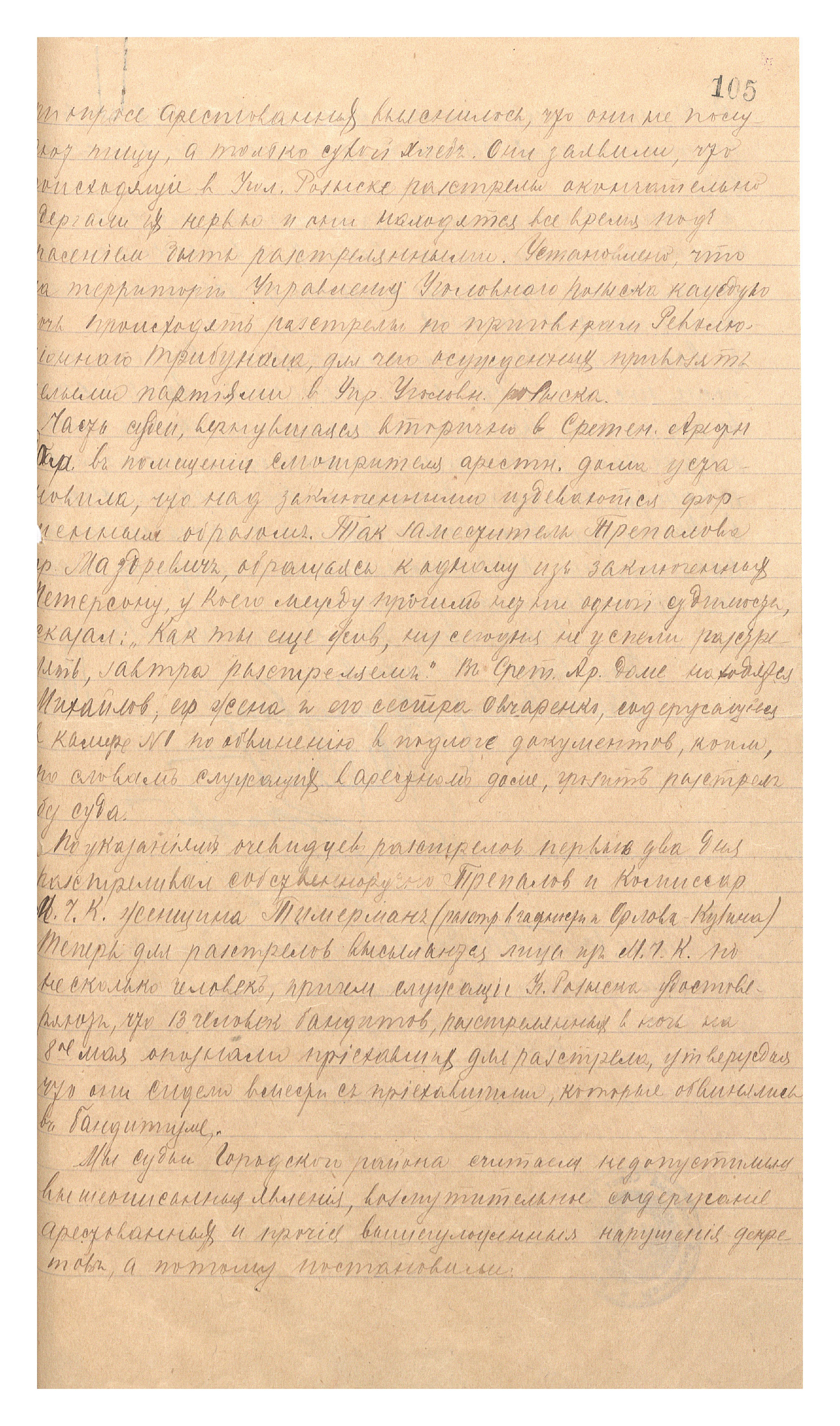 Часть судей, вернувшаяся вторично в Сретен. Арестн. дом в помещение смотрителя арестн. дома, установила, что над заключенными издеваются форменным образом. Так заместитель Трепалова гр. Маздревич, обращаясь к одному из заключенных Петерсону, у коего между прочим нет ни одной судимости, сказал : «Как ты еще жив, ну сегодня не успели расстрелять, завтра расстреляем». В Срет. Ар. Доме находятся Михайлов, его жена и его сестра Овчаренко, содержащиеся в камере №1 по обвинению в подлоге документов, коим, по слова служащих в арестном доме, грозит расстрел без суда.