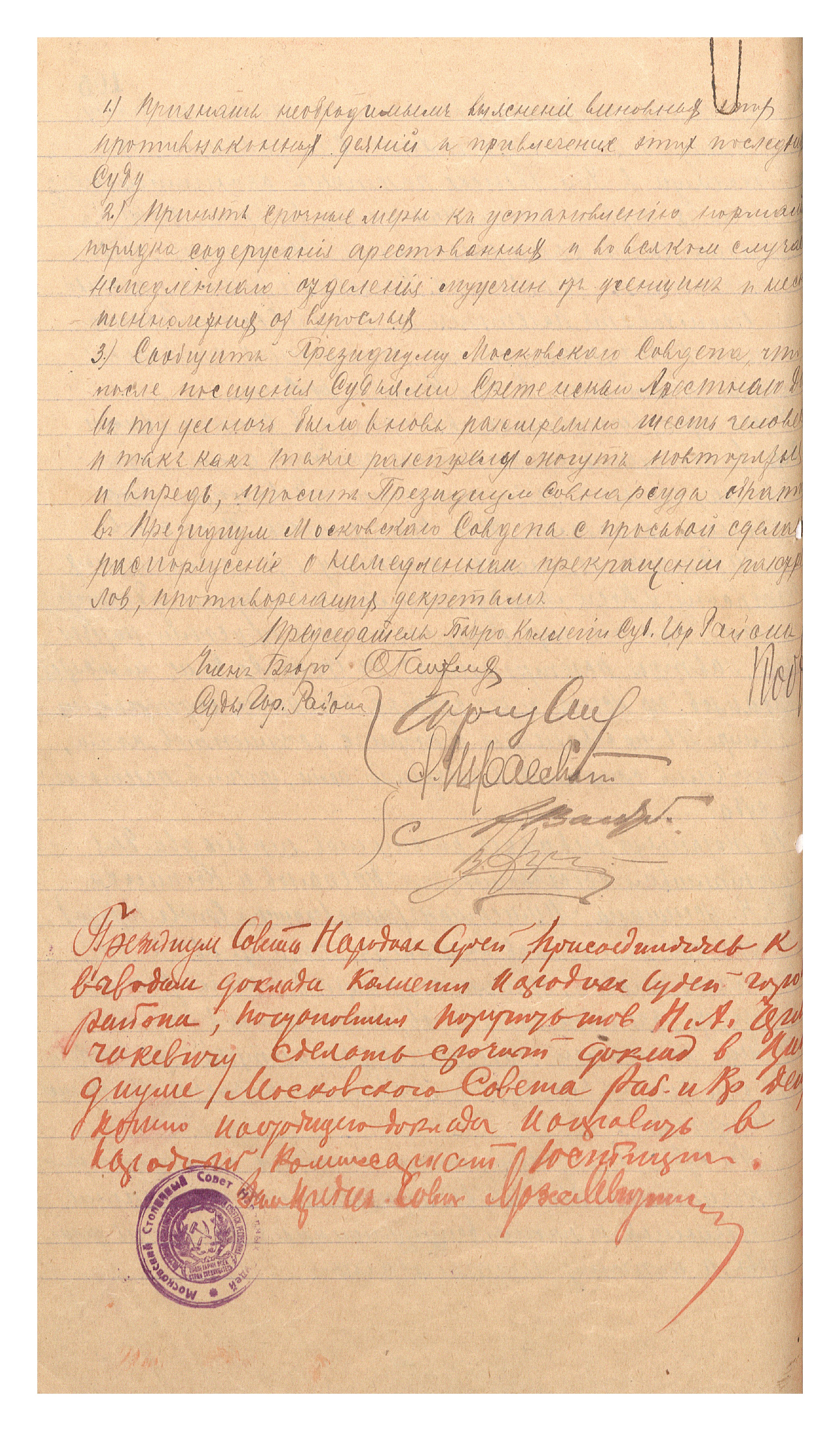 3. Сообщить Президиуму Московского Совдепа, что после посещениями Судьями Сретенского Арестного Дома в ту же ночь было вновь расстреляно шесть человек и так как такие расстрелы могут повторяться и впредь, просить Президиум Совнарсуда обратиться в Президиум Московского Совдепа с просьбой сделать распоряжение о немедленном прекращении расстрелов, противоречащих декретам.