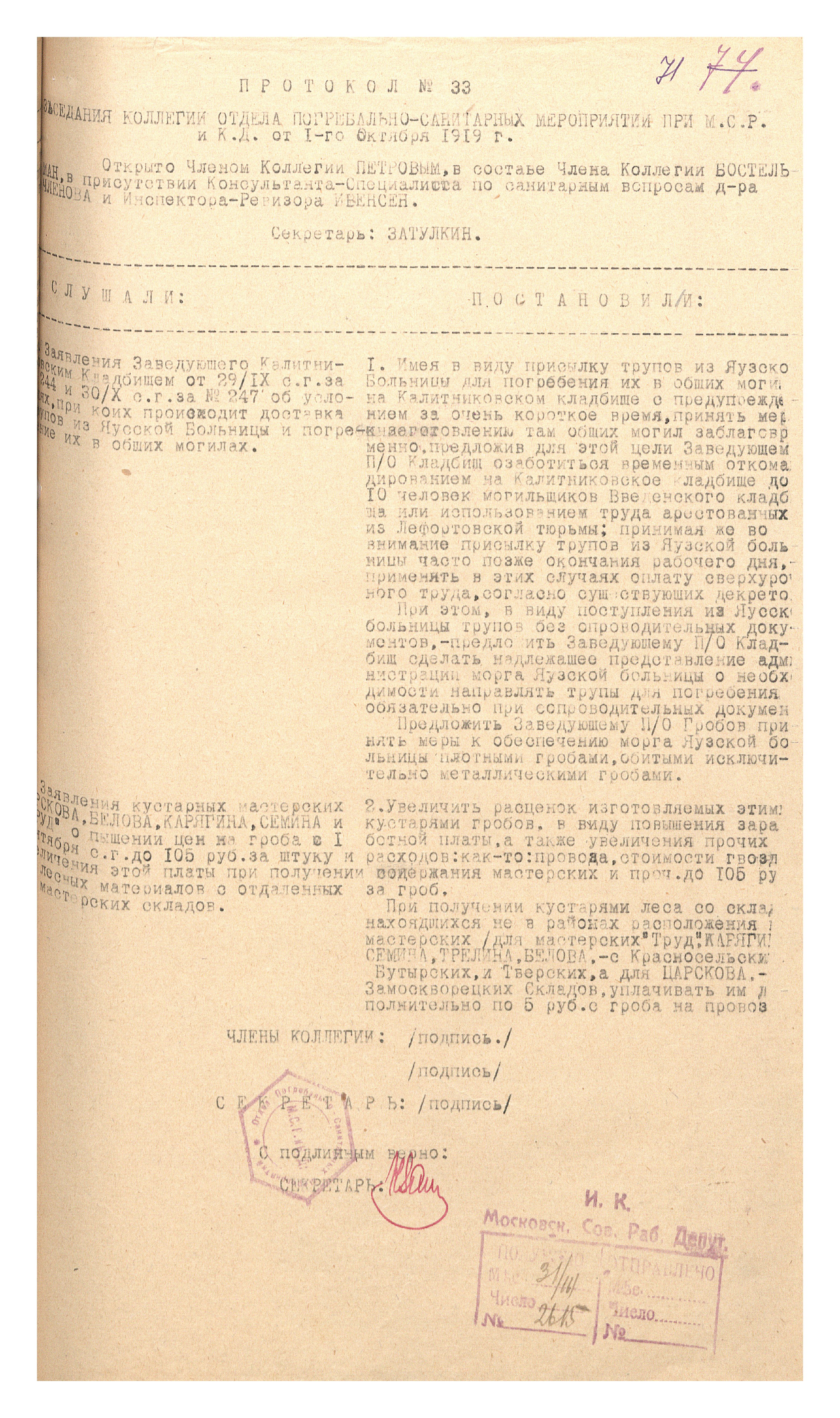 [Л. 71 О захоронениях на Калитниковском кладбище в общих могилах тел, прибывающих из морга Яузской больницы. Предложение использовать могильщиков Введенского кладбища или привлекать арестованных из Лефортовской тюрьмы. Поскольку тела привозят часто позже окончания рабочего дня, то предлагалось применять оплату сверхурочного труда.