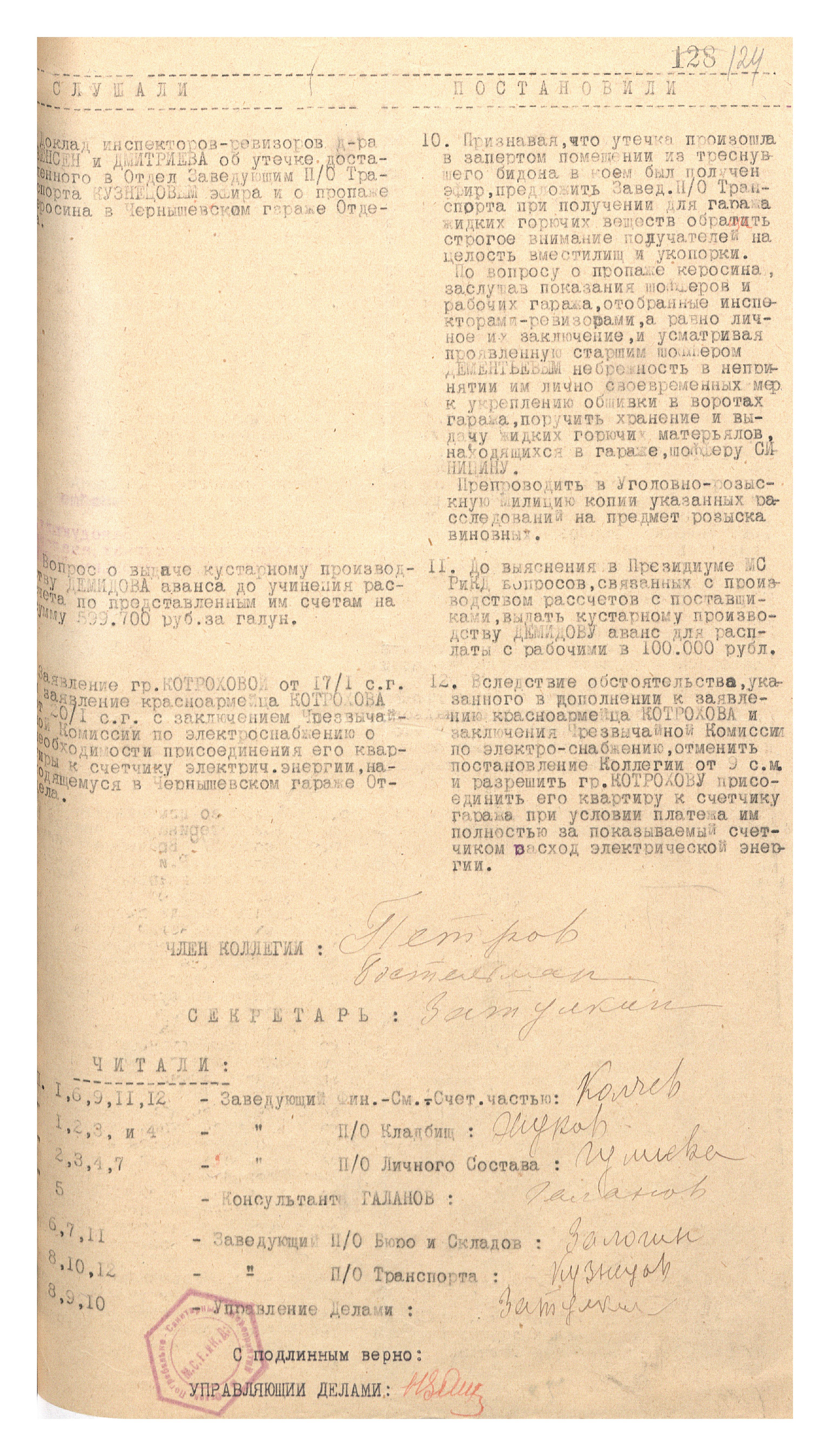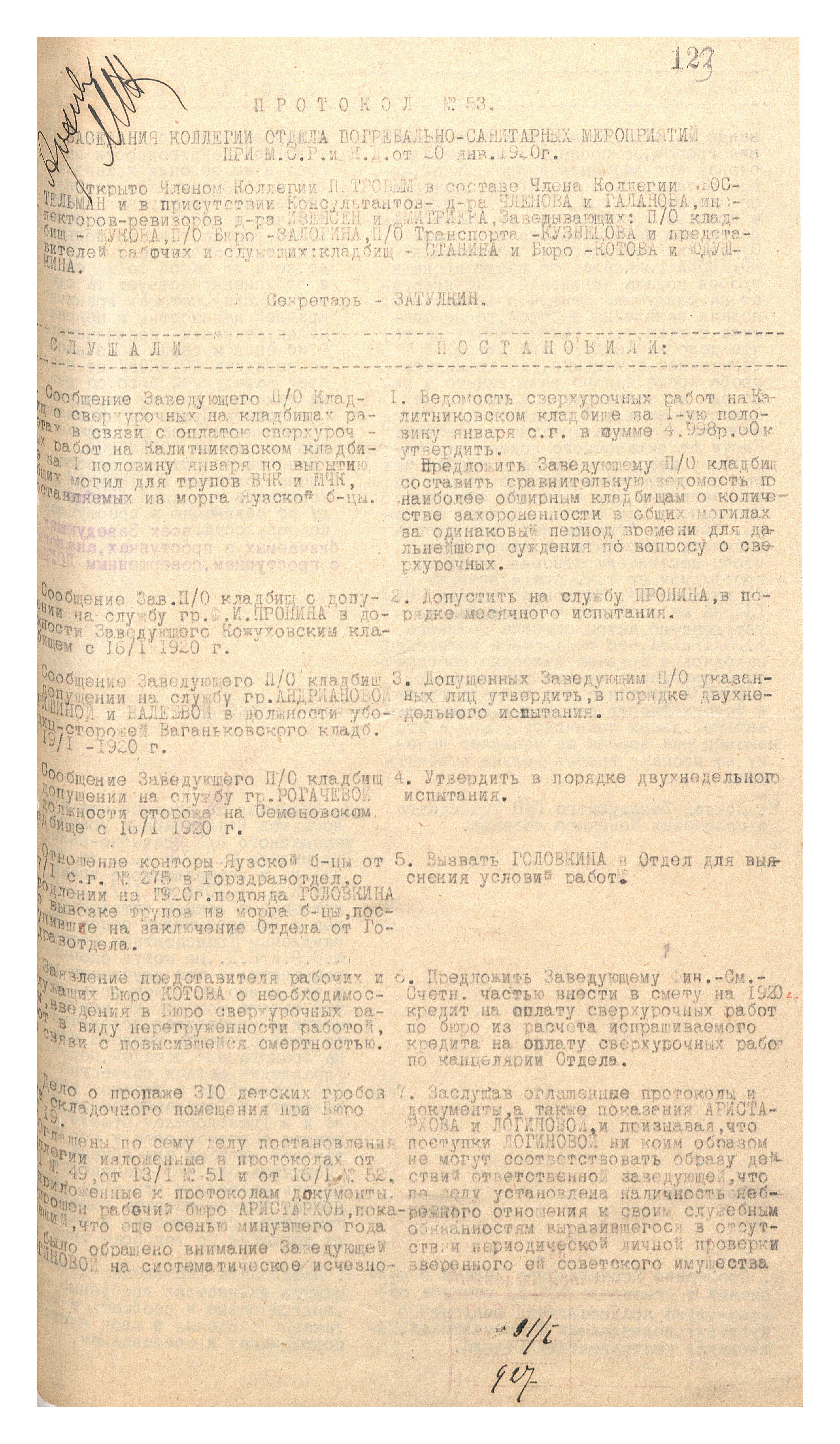 Л. 123 Обсуждение на заседании Коллегии Отдела погребально-санитарных мероприятий вопроса оплаты сверхурочных работ на Калитниковском кладбище "по вырытию общих могил для трупов ВЧК и МЧК, поставляемых из морга Яузской больницы"]