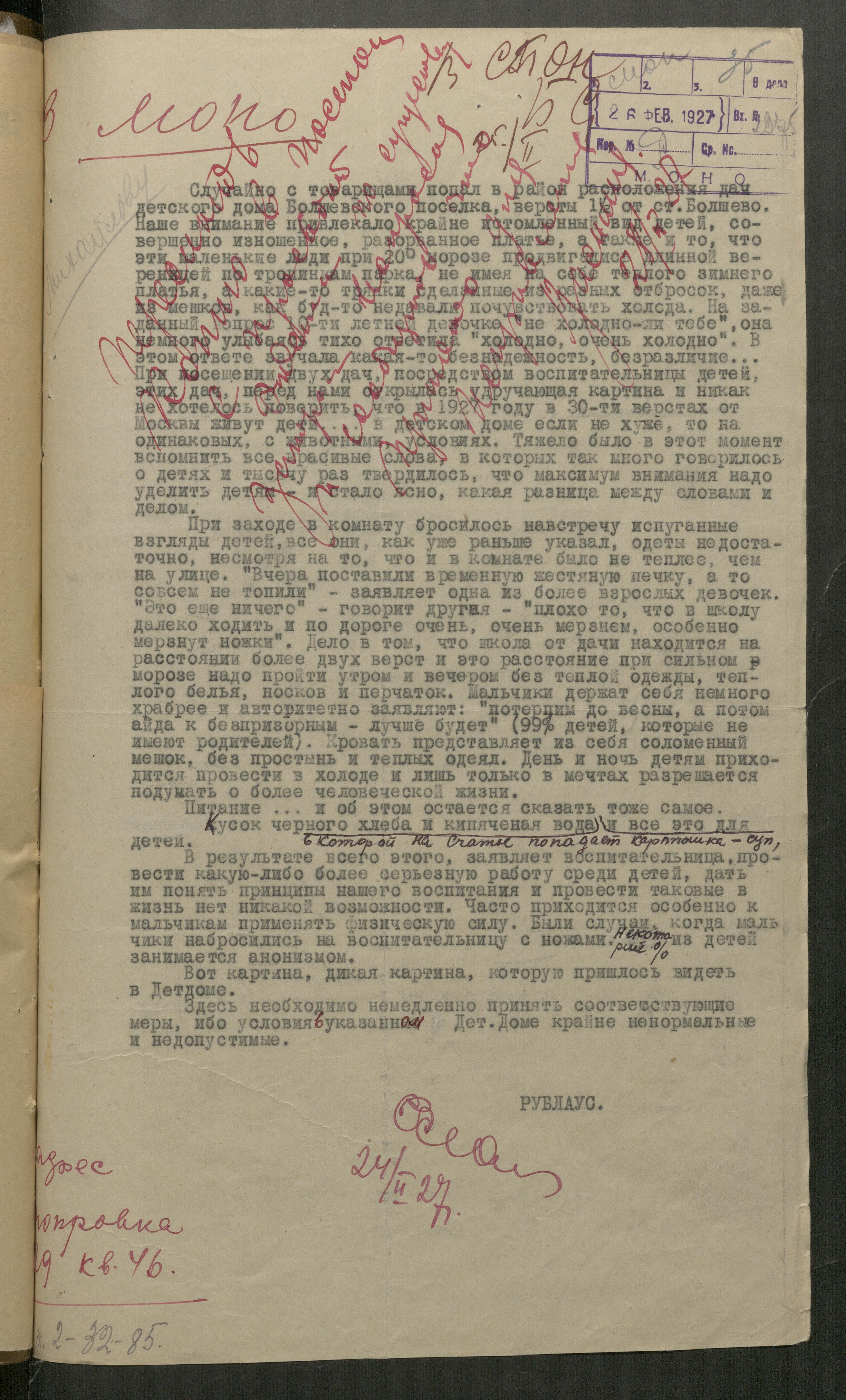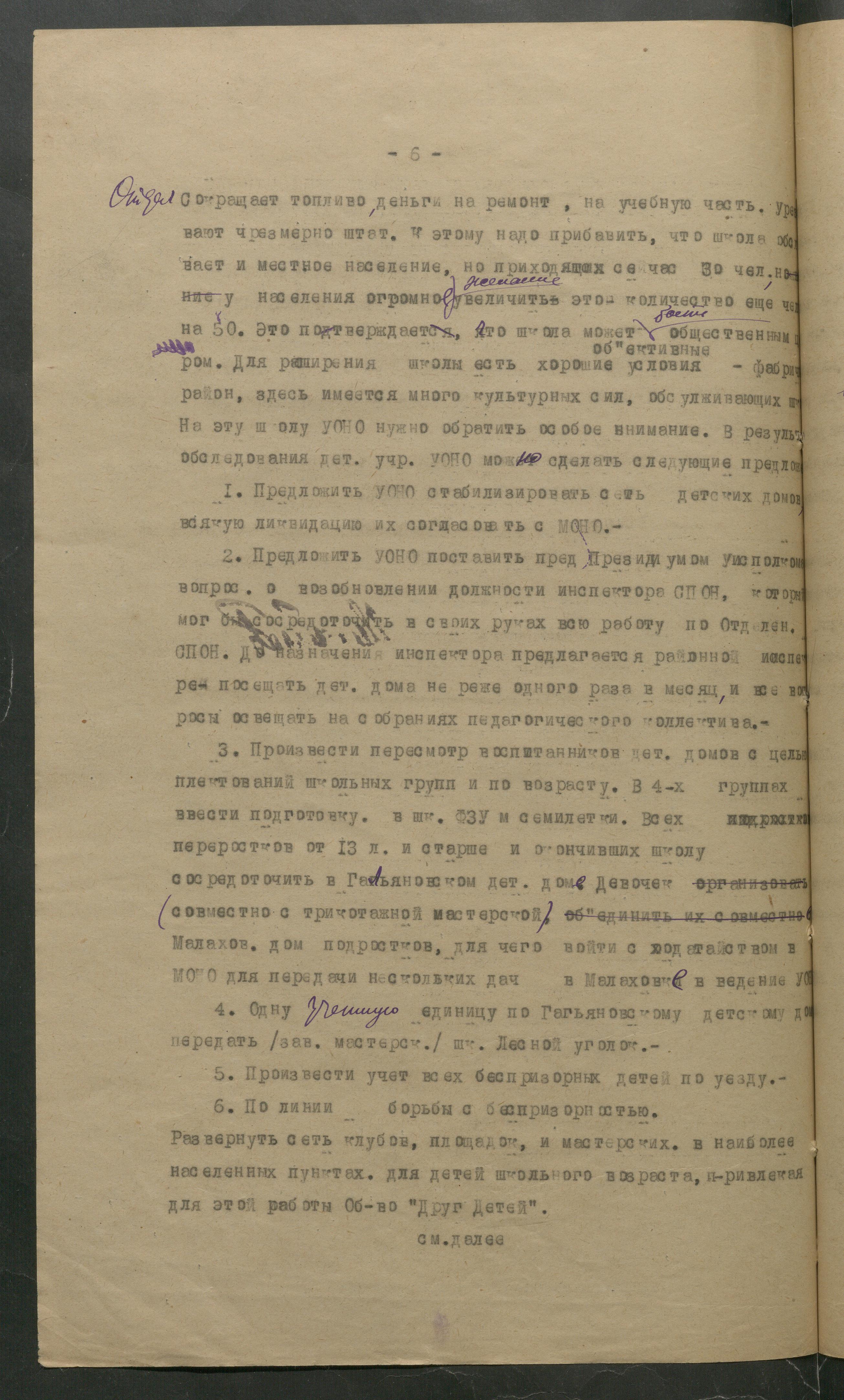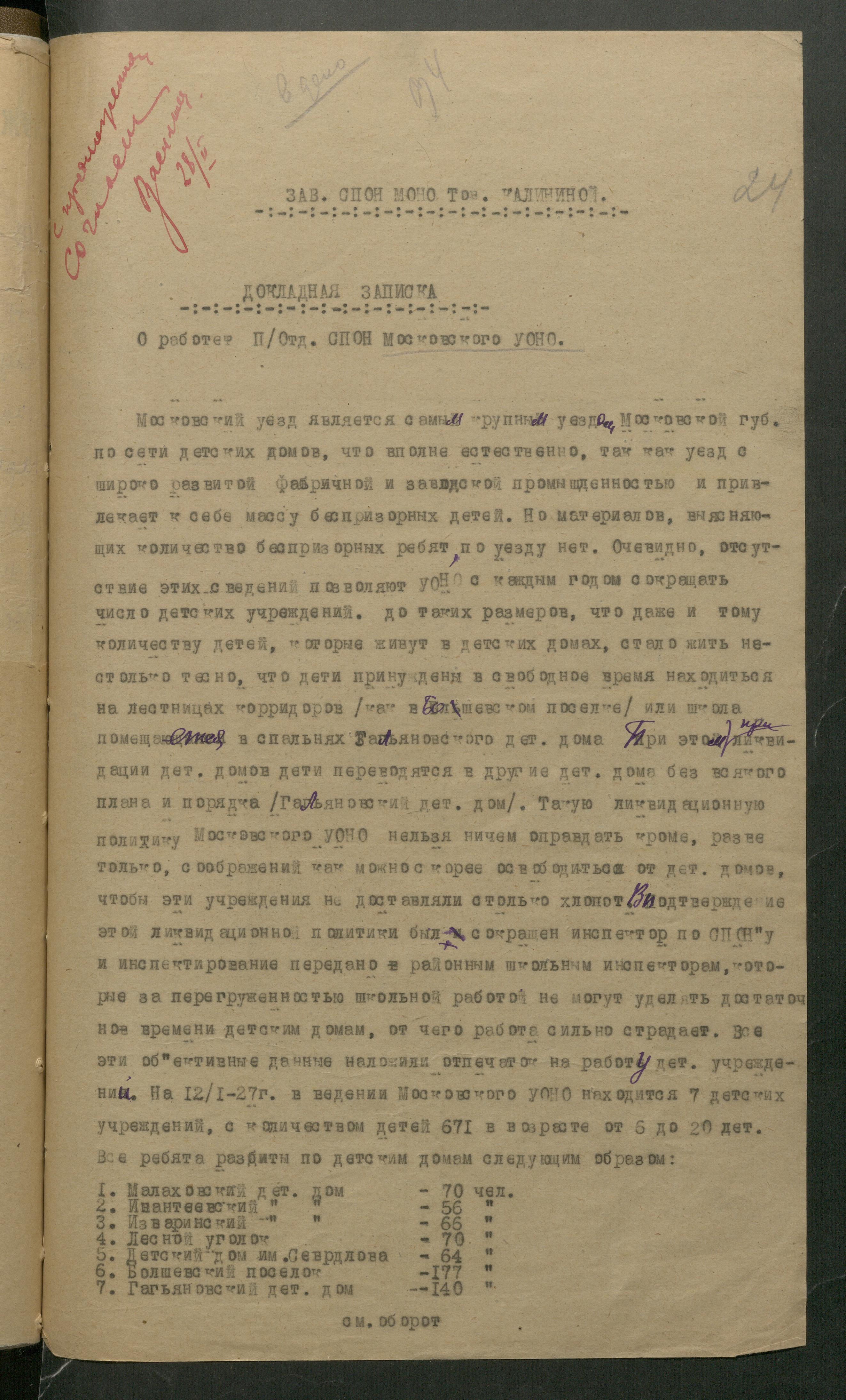 Первый и самый объёмный из представленных документов - Докладная записка заведующей СПОН МОНО А. Д. Калининой. В этом документе указаны проблемы детских домов Московской губернии на 1927 год (недостаток финансирования, недостаток или неисправное состояние оборудования в классах и мастерских, ветхость и неудовлетворительное санитарное состояние помещений, недостаток квалифицированных преподавателей и перегруженность детских домов) и предложены способы устранения выявленных недостатков.