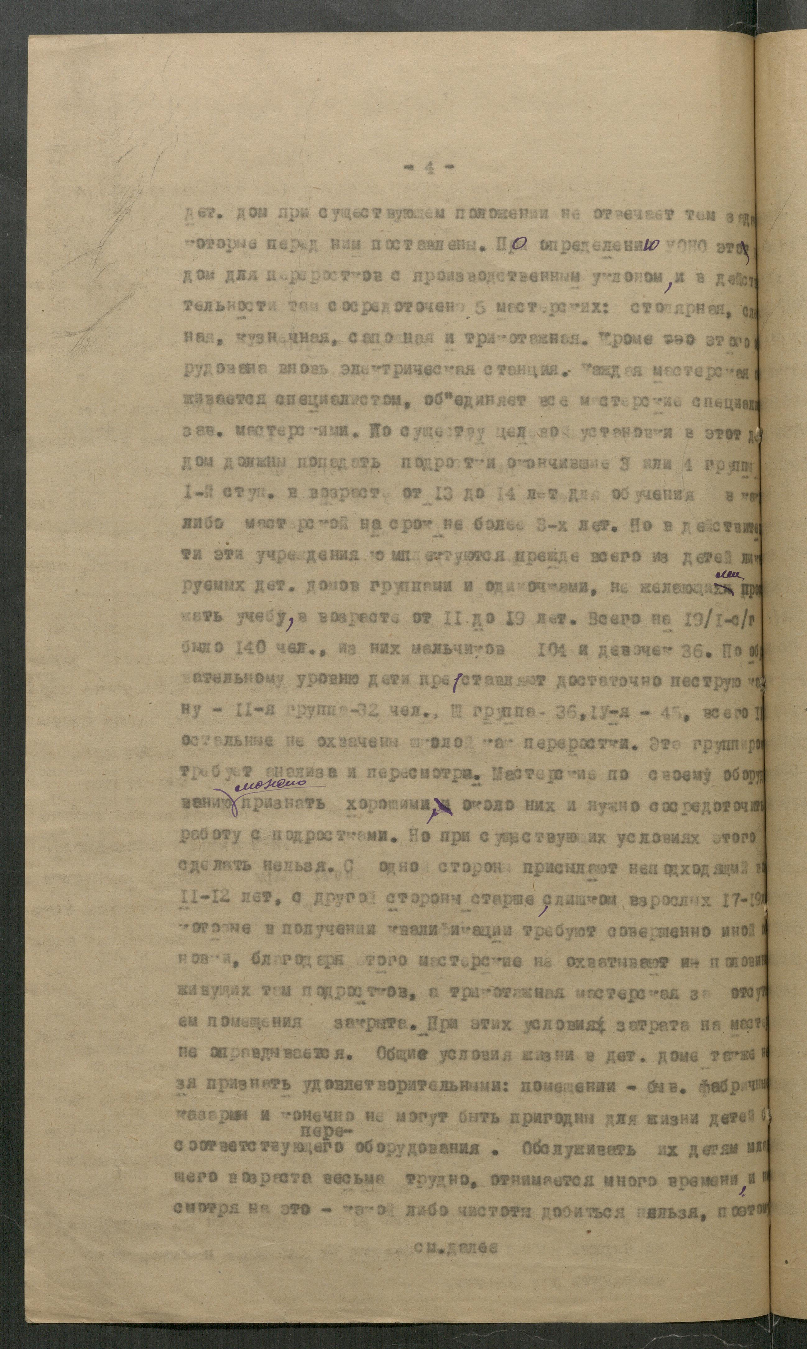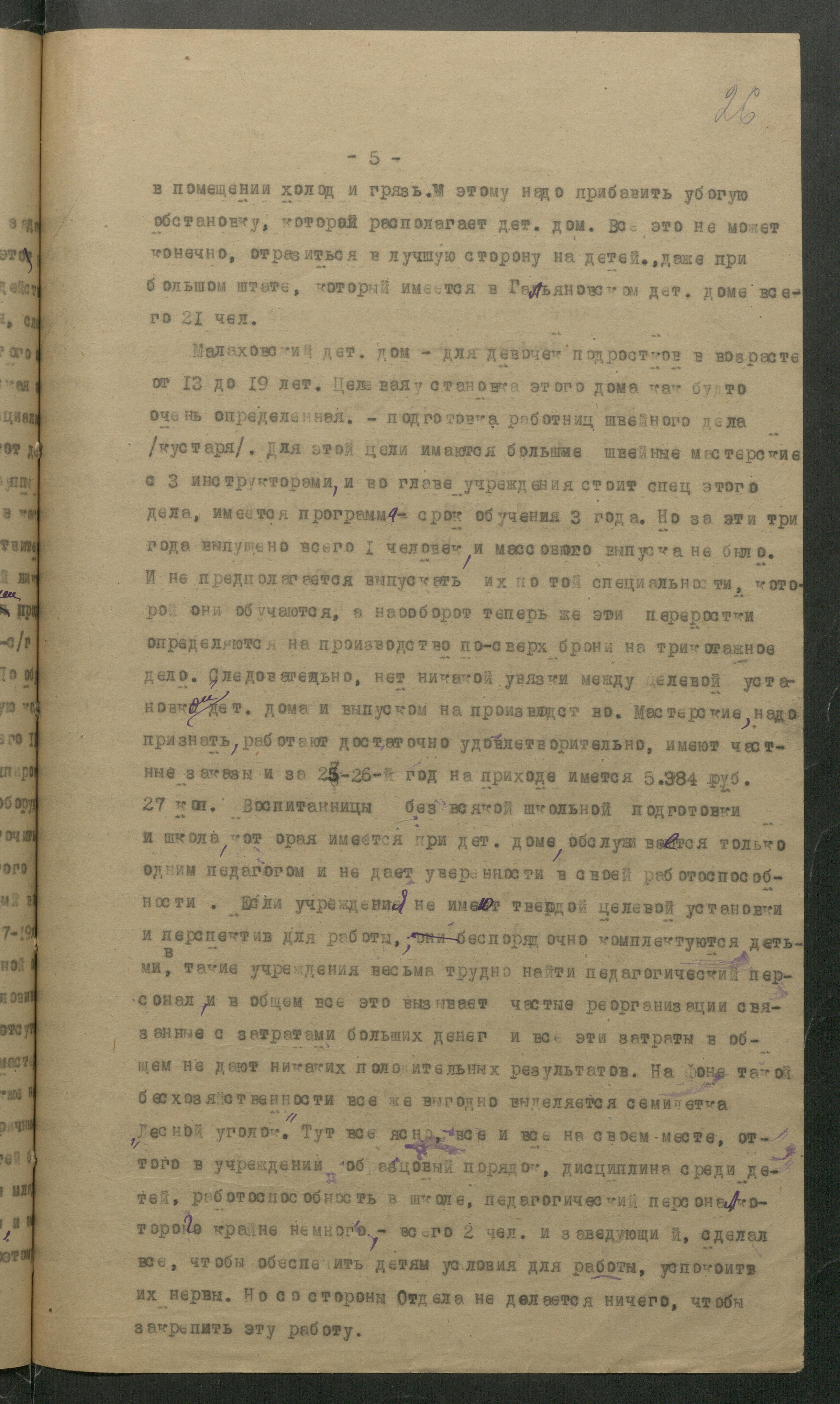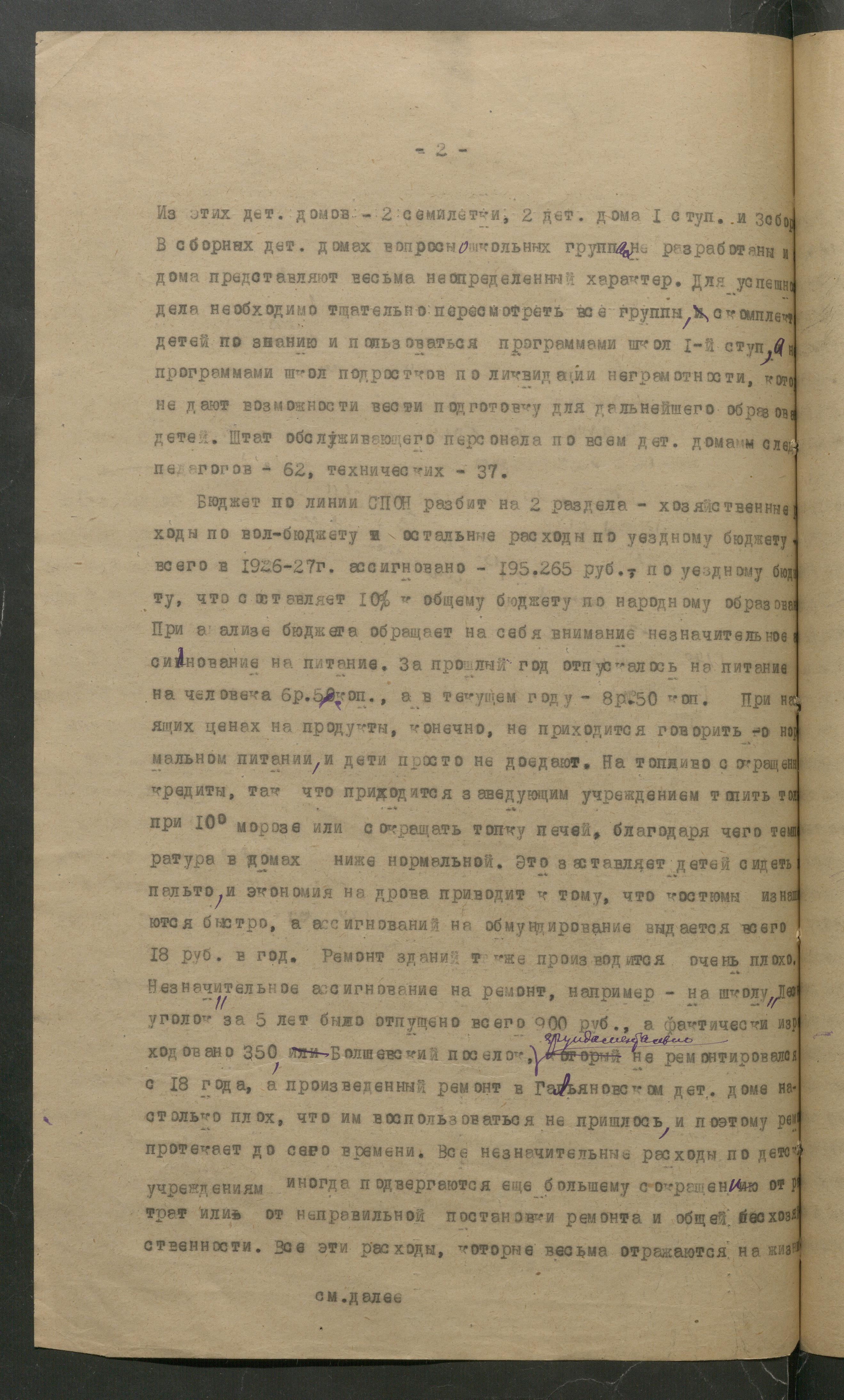 Первый и самый объёмный из представленных документов - Докладная записка заведующей СПОН МОНО А. Д. Калининой. В этом документе указаны проблемы детских домов Московской губернии на 1927 год (недостаток финансирования, недостаток или неисправное состояние оборудования в классах и мастерских, ветхость и неудовлетворительное санитарное состояние помещений, недостаток квалифицированных преподавателей и перегруженность детских домов) и предложены способы устранения выявленных недостатков.