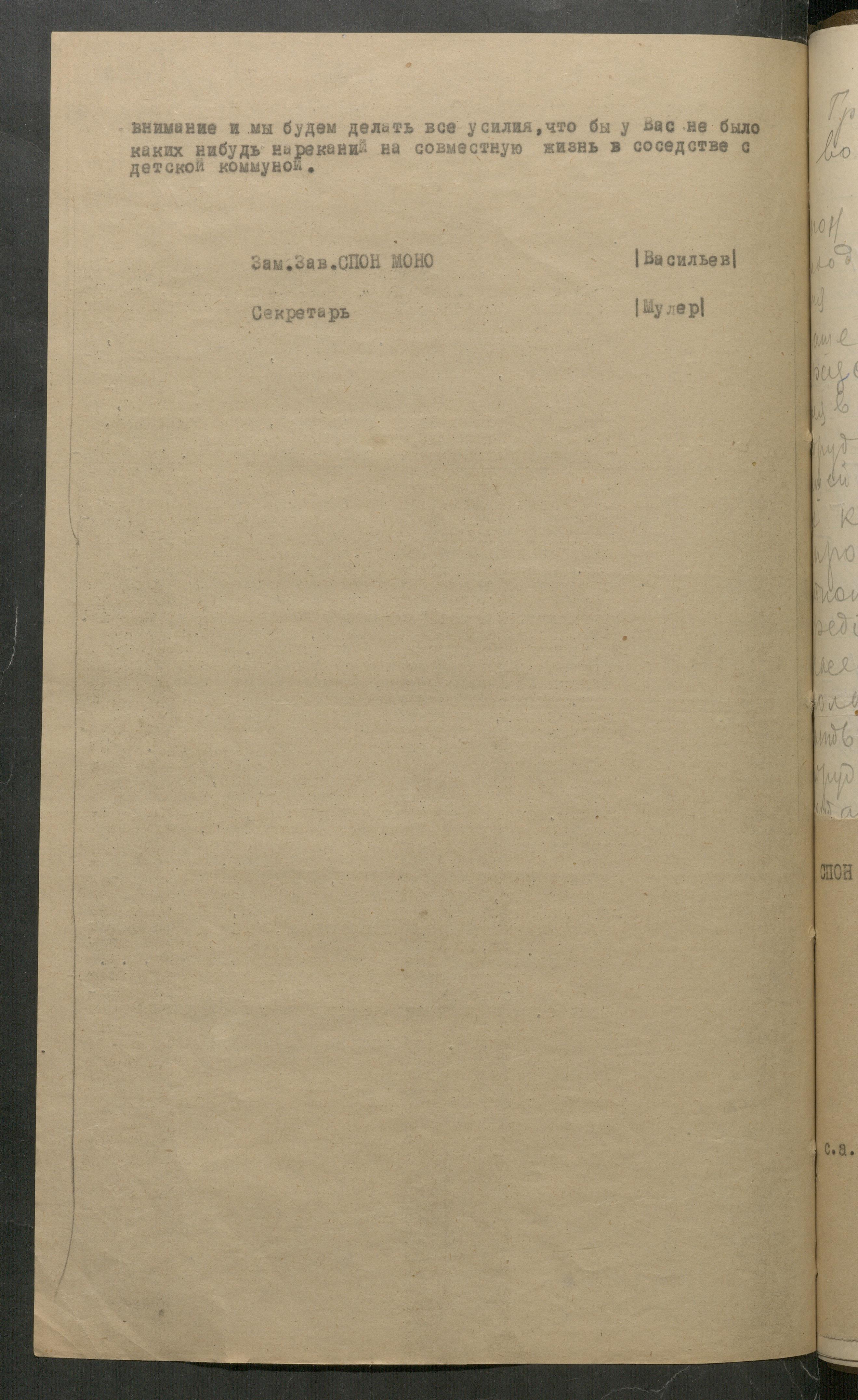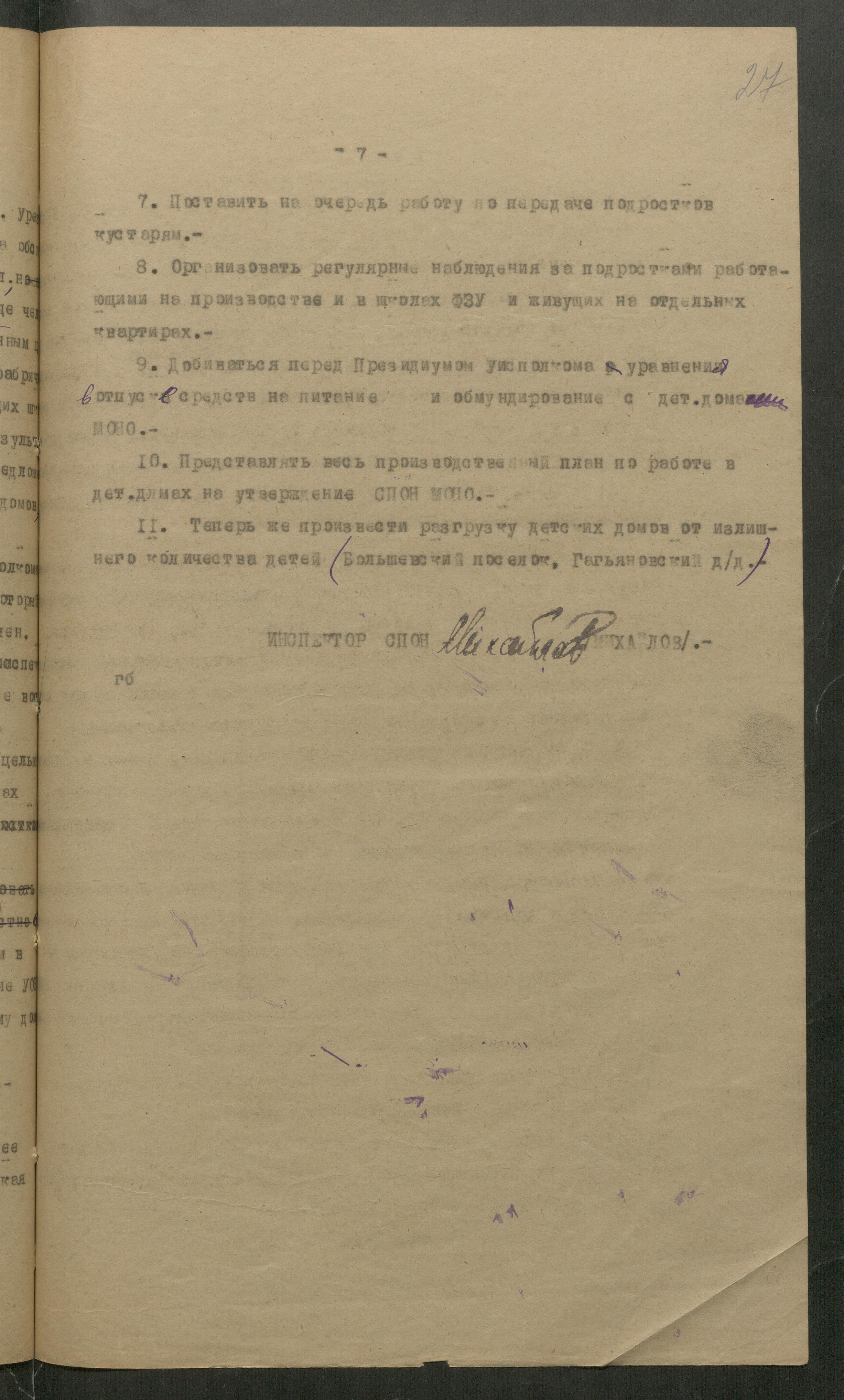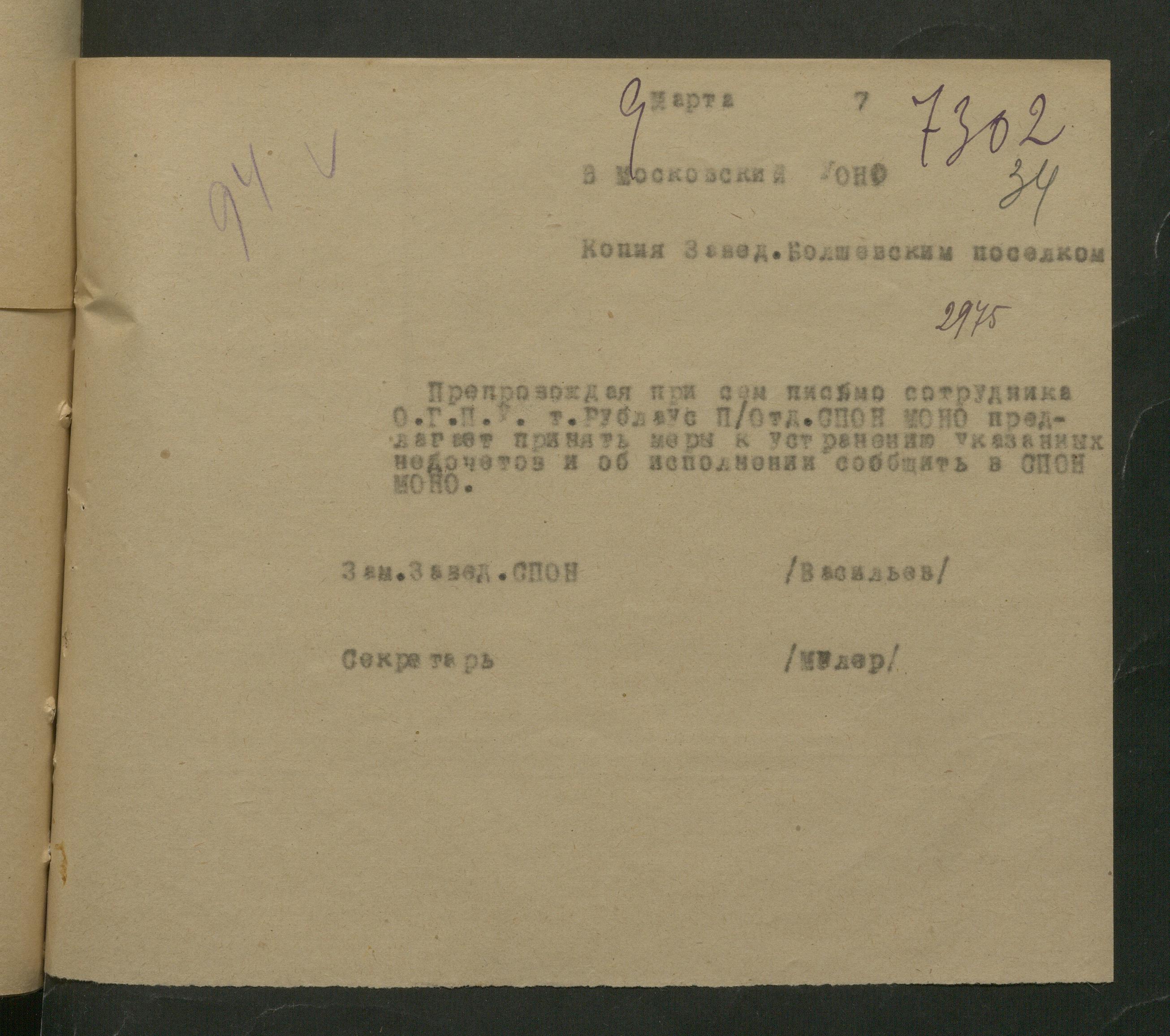 Следующий документ представляет собой записку СПОН МОНО заведующему Болшевским посёлком с приложением письма сотрудника ОГПУ Рублауса, в котором тот сообщает о скудном питании и ветхой одежде воспитанников Болшевского детского дома. СПОН МОНО предлагает заведующему устранить выявленные недостатки и отчитаться об исполнении.