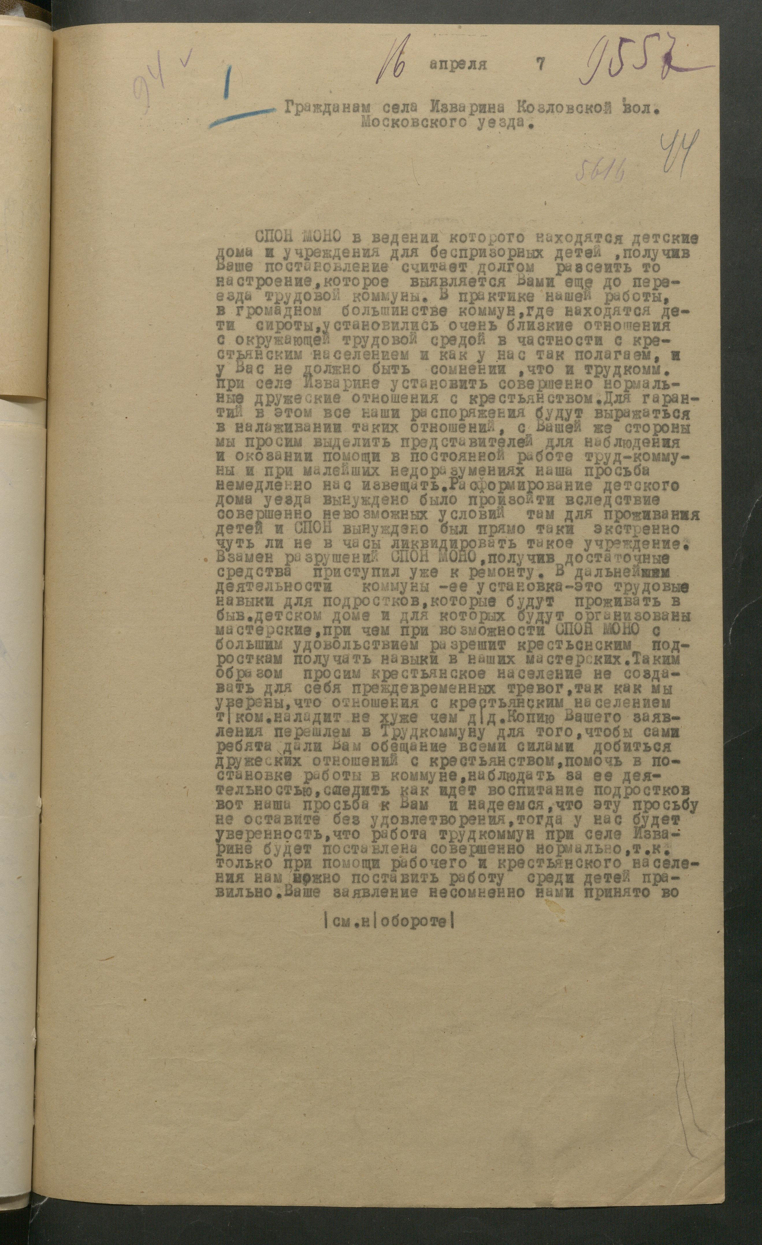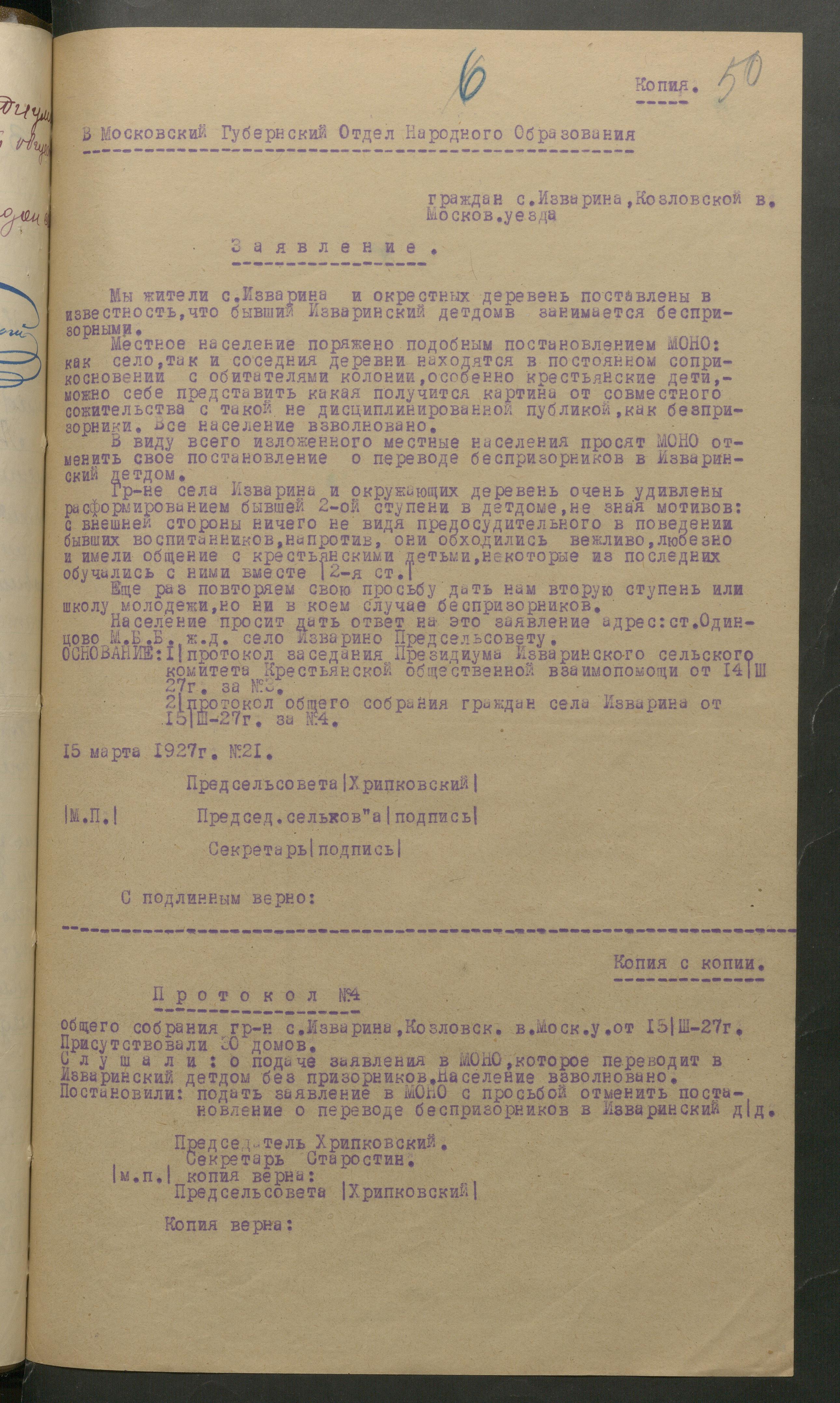 Три представленных далее документа содержат сведения о протесте жителей села Изварина и окрестных деревень против вселения в местный детский дом беспризорников, т. к. проживание рядом с такой "Недисциплинированной публикой" может оказать пагубное влияние на местных крестьянских детей.
