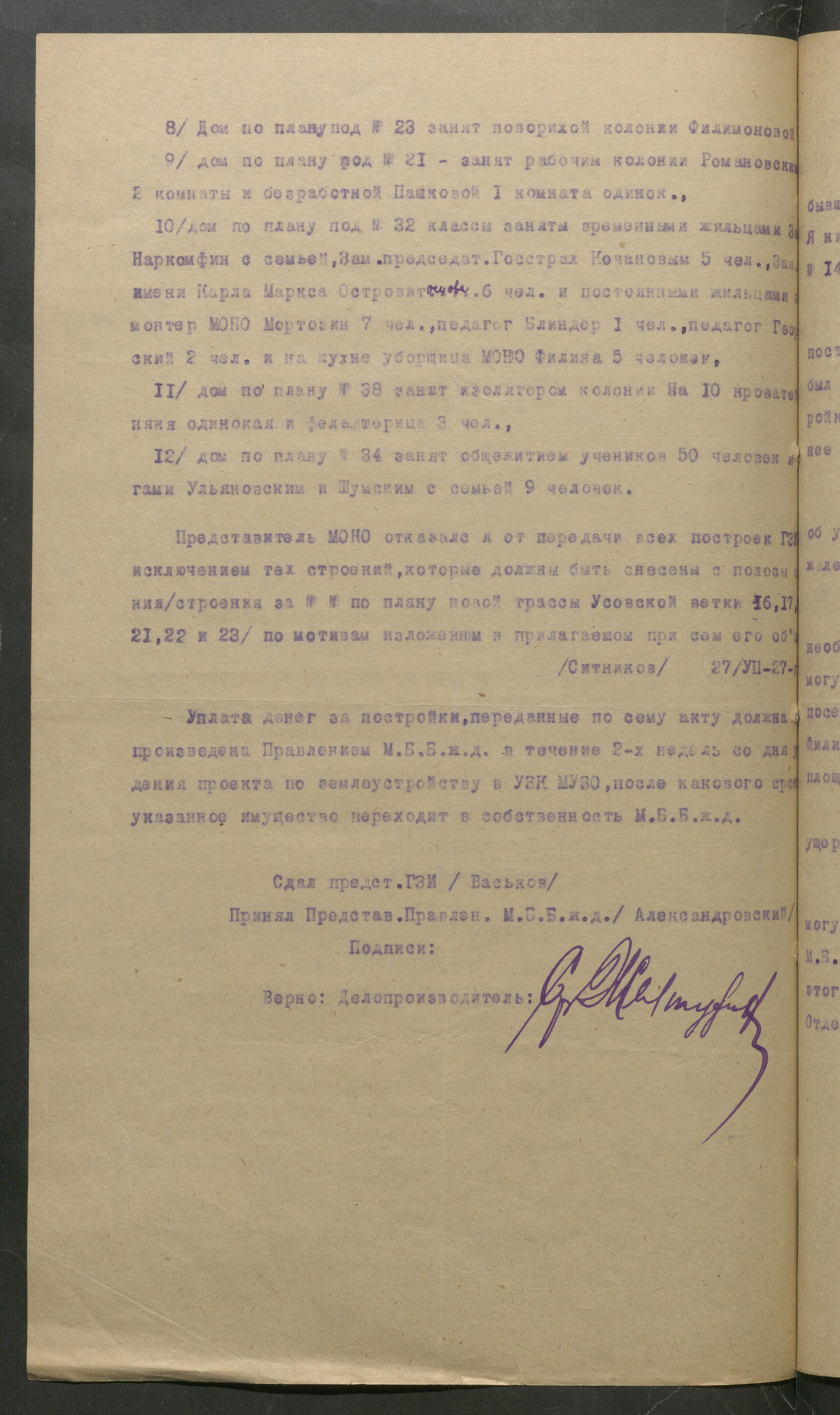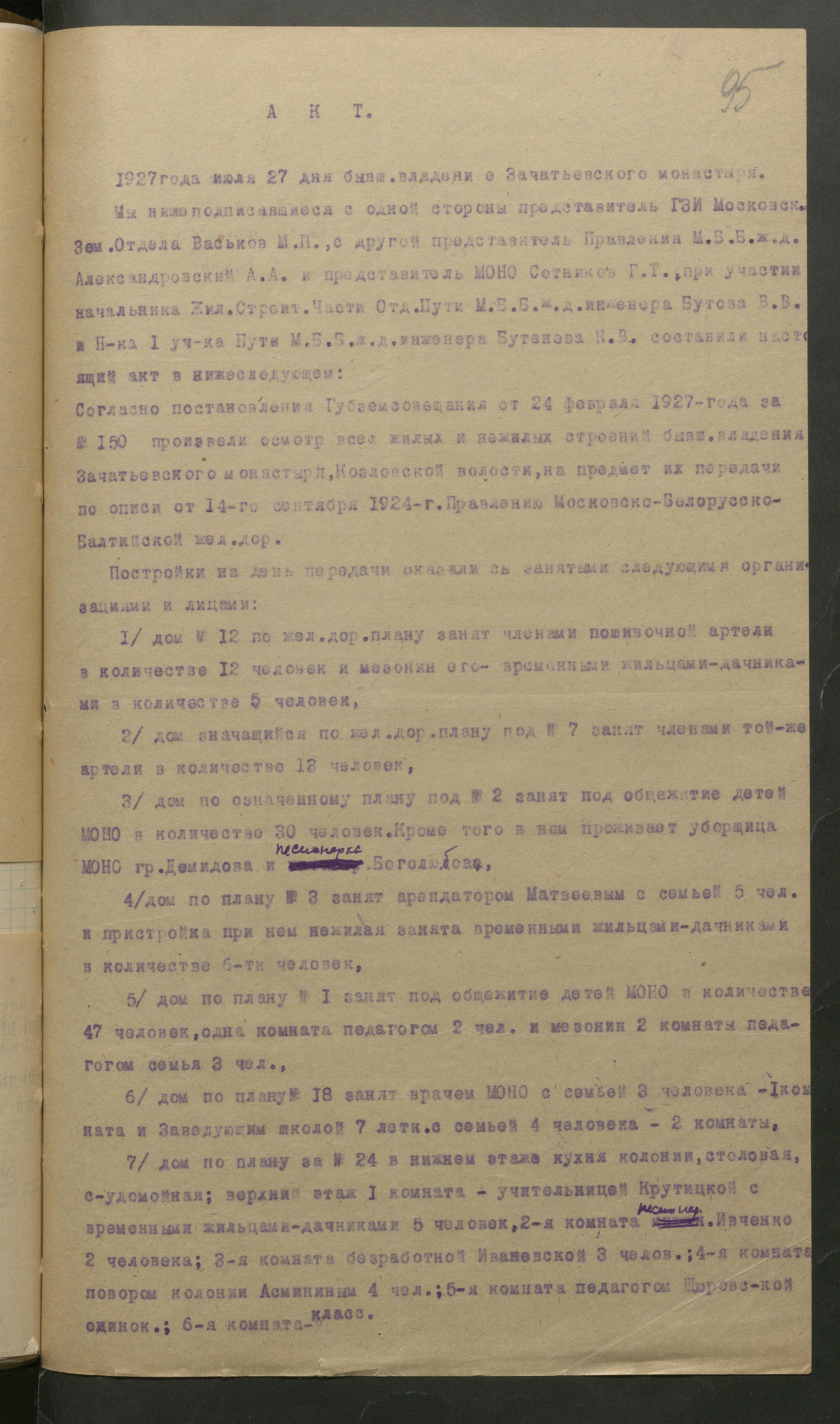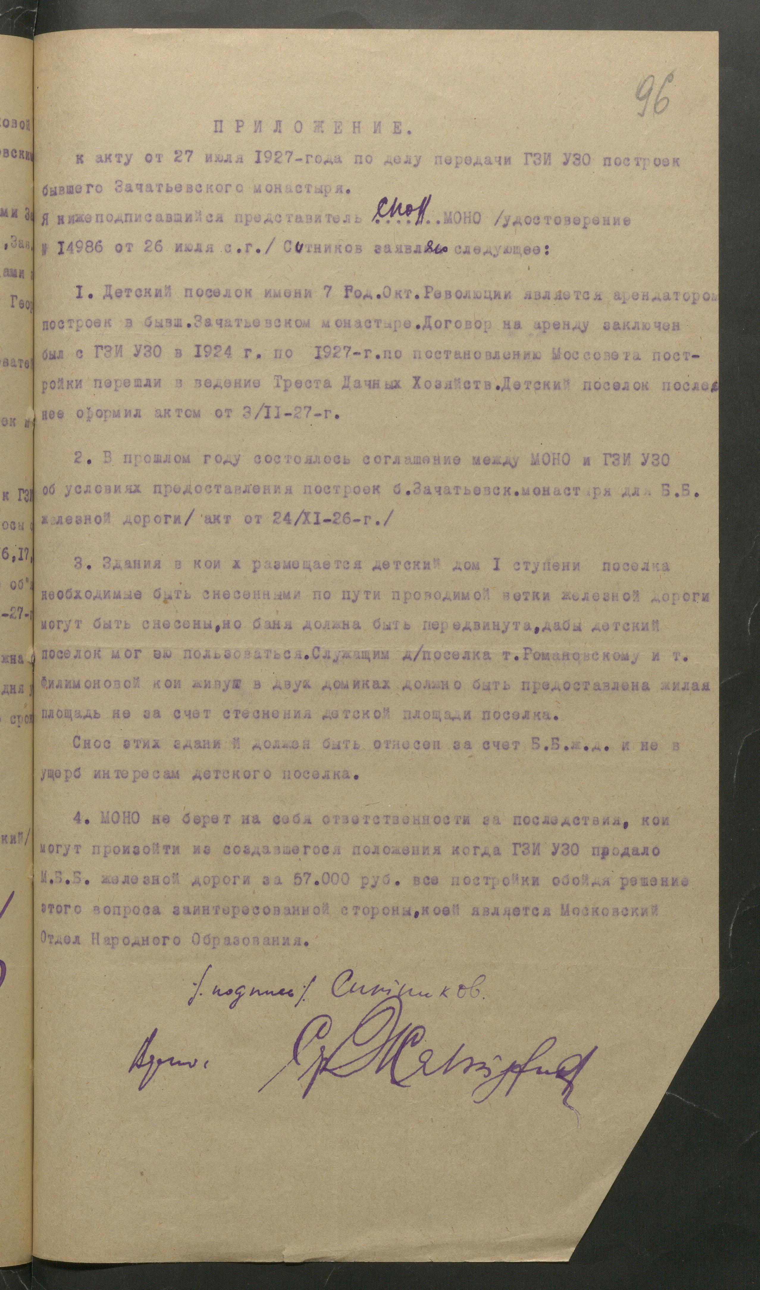 Последний документ - это акт и приложение к нему, составленный и подписанный представителями МОНО с одной стороны и представителями правления Московско-Белорусско- Балтийской железной дороги, с другой стороны, в связи с предстоящим прохождением железнодорожной ветки через территорию, ранее являвшуюся владением Зачатьевского монастыря, а на момент составления акта, занятую пошивочной артелью и общежитиями сотрудников МОНО.